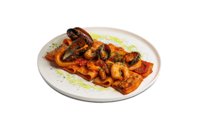 Paste, creveți, midii, carne scoici, inele calamar, ulei de măsline, usturoi, sos roșii, busuioc, vin